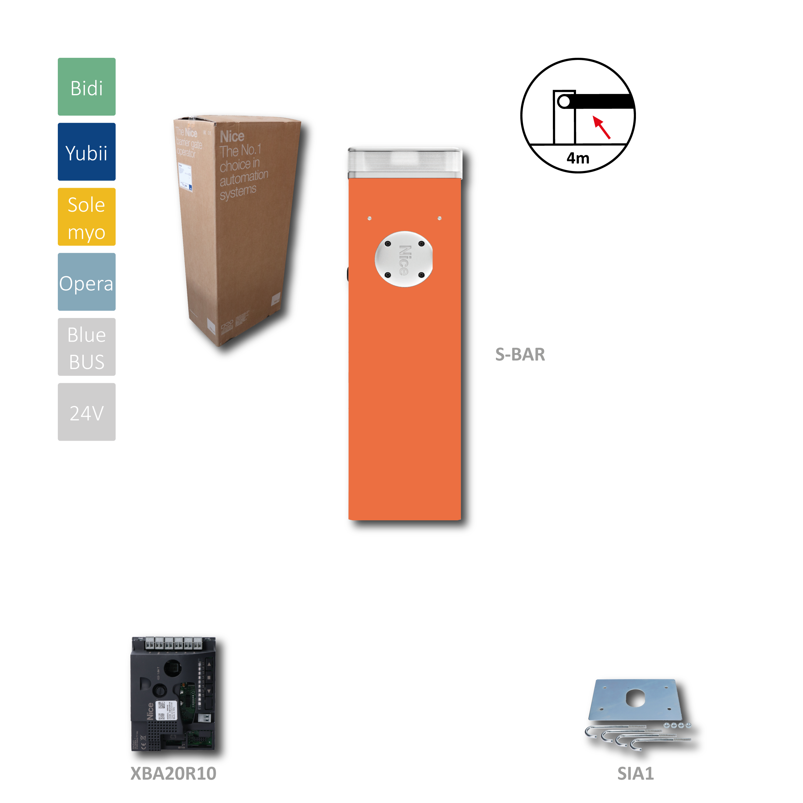 S4BAR automatická závora do 4m prejazdu (24V, 300W, 100Nm) s riadiacou jednotkou XBA20, 1 x montážna doska SIA1, bez ramena