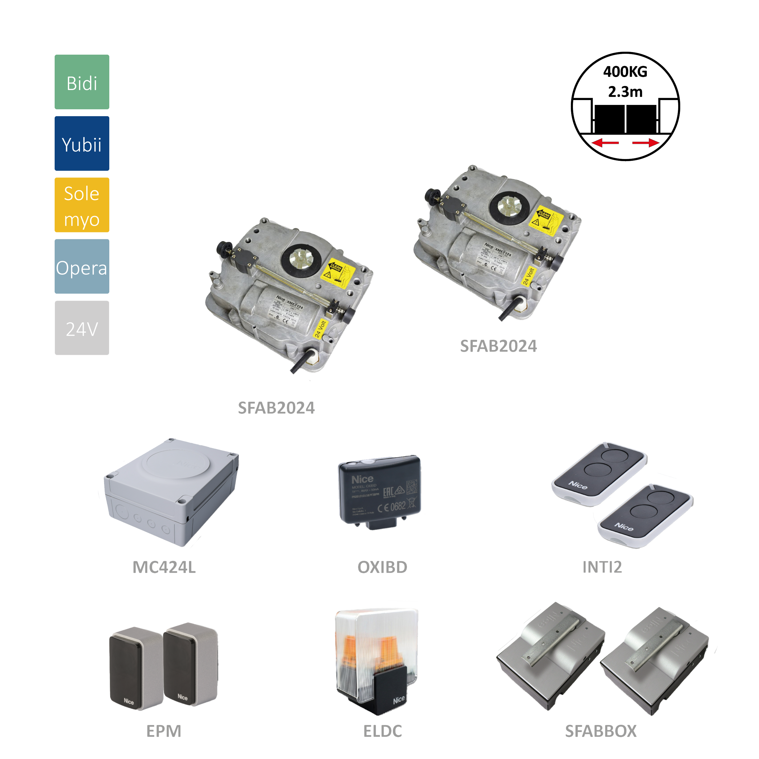 SFAB2024BDKCE Podzemná sada pre dvojkrídlovú bránu do 2,3m/krídlo, 2x SFAB2024 (24 V, 120 W, 250 Nm), 1x MC424L, 2x ON3EBD, 1x OXIBD, 1 pár EPM,1x ELDC, 2x SFABBOX